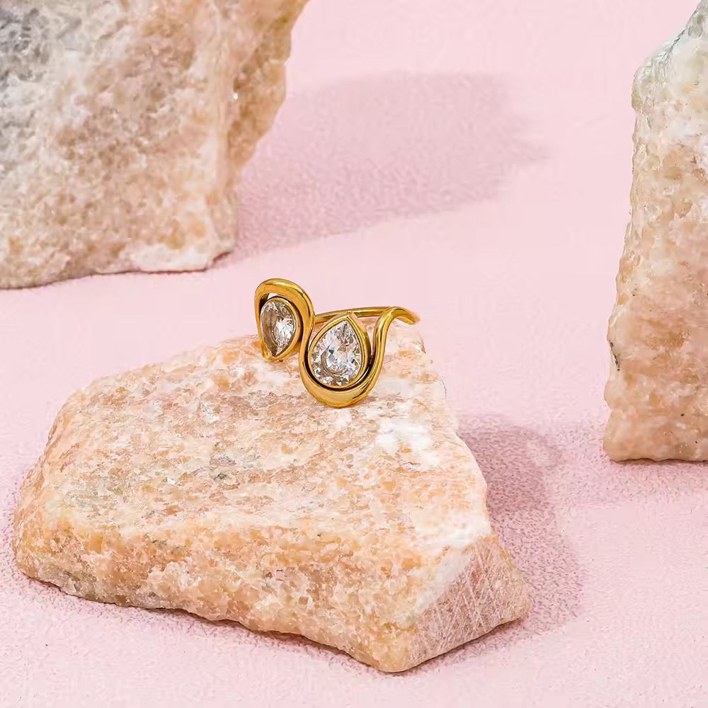 Gold toned curve ring featuring a pear cut crystal paired with a vibrant stone